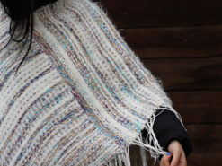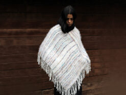 Čupkavi mekani i topli pončo, nežan kao pahulja. Izrađen je od baršunaste akrilne vune i pamuka. Može se nositi i preko jakne.